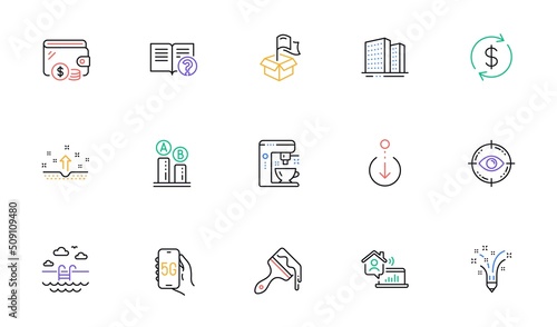 Delivery location, Inspiration and 5g internet line icons for website, printing. Collection of Coffee maker, Clean skin, Buildings icons. Ab testing, Help, Wallet web elements. Work home. Vector