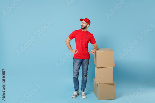 Delivery man in red uniform isolated on blue background, studio portrait. Male employee in cap t-shirt print working as courier dealer hold empty cardboard box. Service concept. Mock up copy space.
