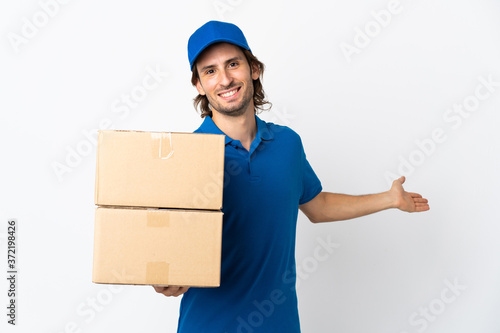 Delivery man isolated on white background extending hands to the side for inviting to come