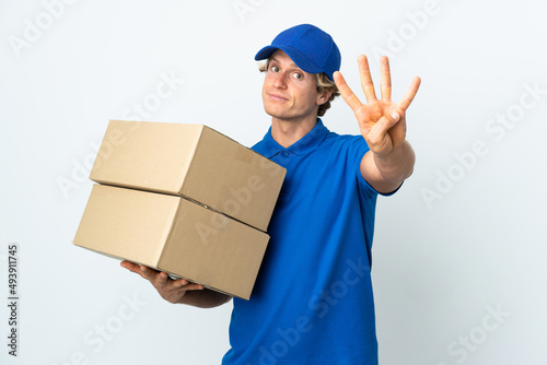Delivery man over isolated white background happy and counting four with fingers