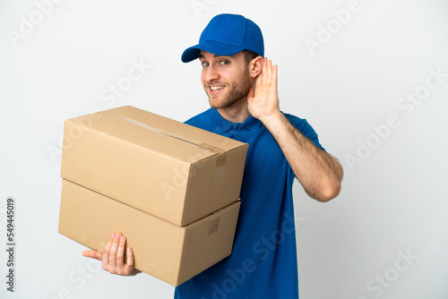 Delivery man over isolated white background listening to something by putting hand on the ear