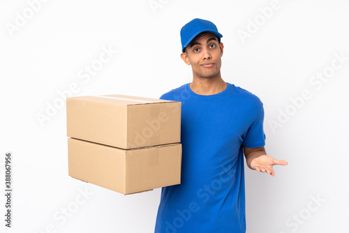 Delivery man over isolated white background making doubts gesture while lifting the shoulders