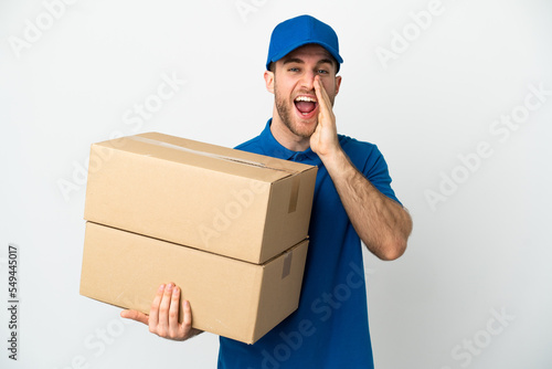 Delivery man over isolated white background shouting with mouth wide open