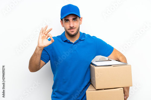 Delivery man over isolated white background showing an ok sign with fingers