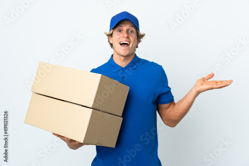 Delivery man over isolated white background with shocked facial expression