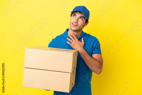 Delivery man over isolated yellow wall looking up while smiling