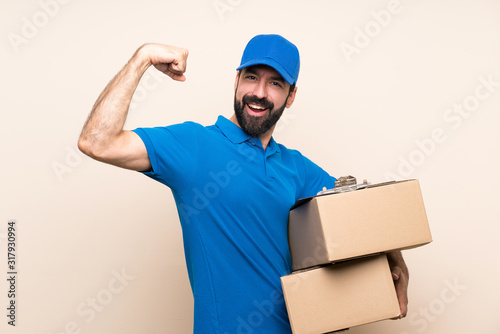 Delivery man with beard over isolated background doing strong gesture
