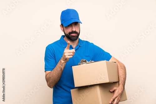 Delivery man with beard over isolated background frustrated and pointing to the front
