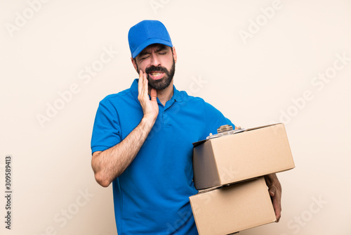Delivery man with beard over isolated background with toothache