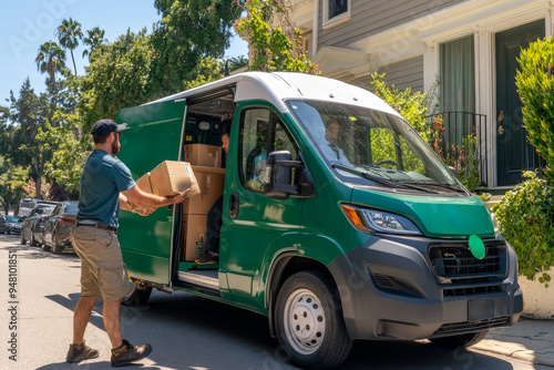 Delivery person unloading packages from a green van on a sunny street in a residential neighborhood with trees and houses nearby