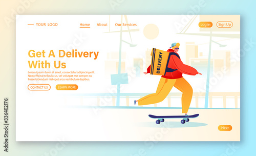 Delivery service concept for landing page. Flat cartoon character rides on skateboard, works as a courier. On shoulders is backpack with package. Against backdrop of urban morning landscape.