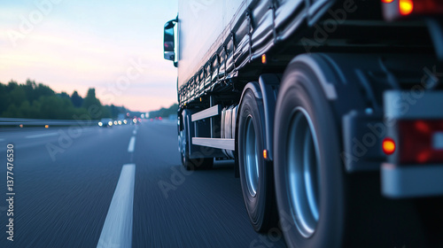 delivery truck travels swiftly on highway at sunset, showcasing motion and speed