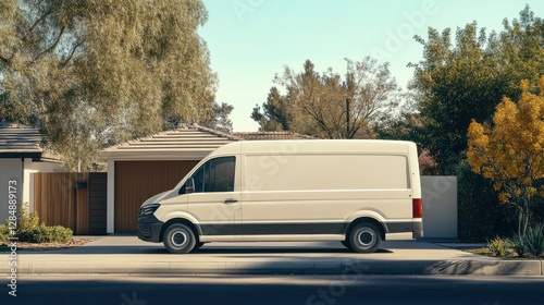 Delivery Van Parked in Suburban Neighborhood with Beautiful Landscaping and Clear Sky