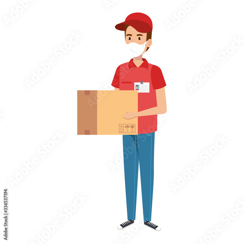 delivery worker using face mask with box carton vector illustration design