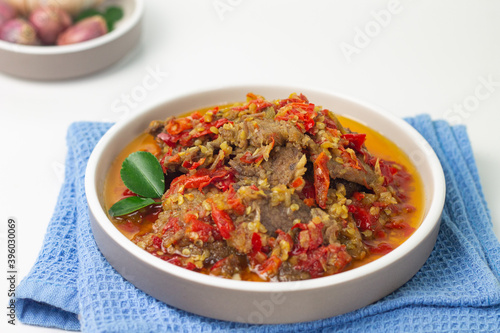 Dendeng Balado, Indonesian traditional beef cuisine from Padang, West Sumatra with slices beef cooked with some spices and a lot of chilies. Served on ceramic plate and isolated white background.