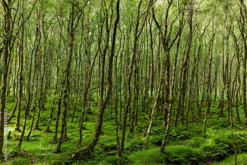 Dense birch woodland with mossy floor in Wicklow, Ireland