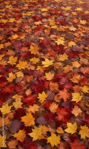 Dense carpet of fallen leaves in shades of golden yellow, burnt orange, and deep crimson, deciduous trees, leaf carpet