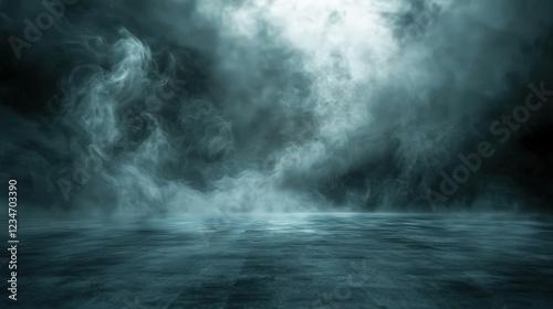 Dense fog rolling over a shadowy landscape, creating an eerie and mysterious atmosphere with deep blue and grey tones. Perfect for horror, thriller settings, and dramatic backgrounds.