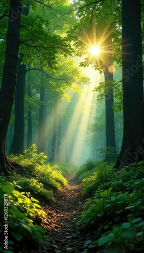 Dense foliage amidst sunlight filtering through forest canopy, vegetation, greenery