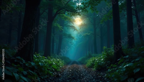 Dense foliage blocks moonlight from reaching path, pathway, forest foliage light blocking woodland canopy darkness, shadows