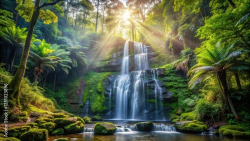 Dense forest canopy with sunlight filtering through gaps and a majestic waterfall cascading down rocky terrain, surrounded by greenery and ferns, rocks, natural wonder