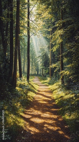 Dense forest with tall trees and abundant greenery illuminated by sunlight streaming through the canopy. A winding dirt path cuts through the forest floor, dappled with patches of light and shadow. Th
