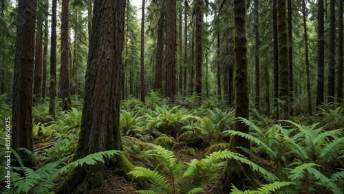 Dense Forest with Tall Trees, Sunlight Filtering Through, and Lush Ferns