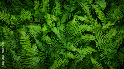 Dense Green Fern Foliage Texture Background in Bright Summer Light