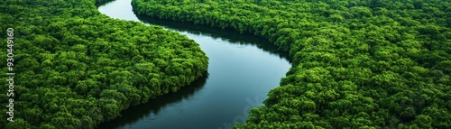 Dense green forest with a winding river, Dense forest river view, Lush vegetation and clear water