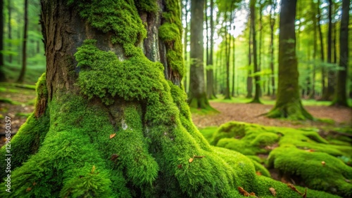 Dense green moss covering tree trunk and branches in a forest environment, nature, trees, nature, trees