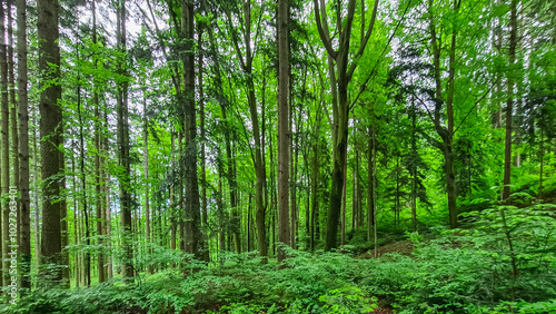 Dense, lush forest with towering trees draped in vibrant green foliage. Canopy, casting dappled shadows on forest floor. Vines and creepers climb tree trunks, adding to intricate tapestry of nature