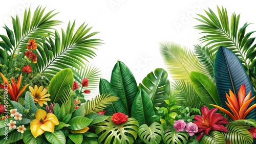 Dense tropical foliage with lush green leaves and colorful flowers isolated on white background