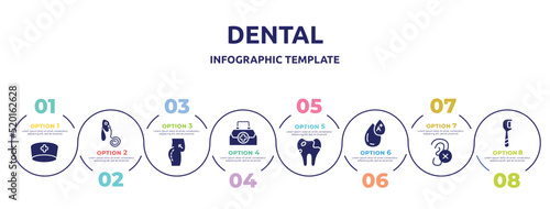 dental concept infographic design template. included doctor cap, oxygen mask, butt, doctor briefcase, caries, type a, impaired, floss icons and 8 option or steps.