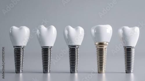 Dental implants showcasing modern dentistry technology, with one golden option and grey backdrop, perfect for medical information.
