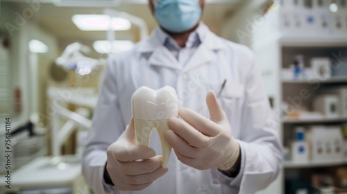 dentist showing a big tooth in a real office with good lighting