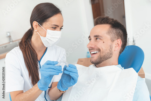 Dentist shows invisible braces aligner