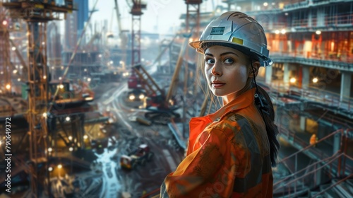 Depict a portrait of an engineer standing amidst a bustling construction site, their helmet and safety suit blending seamlessly with the industrial backdrop