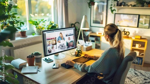 Depict a remote worker engaging in a video conference from a bright, modern home office