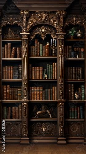 Depict ornate vintage bookshelves with intricate carvings and hints from famous literary works in a surprising top-down angle evoking a sense of mystery and elegance reminiscent of