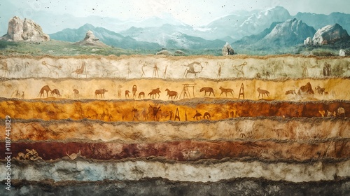 Depiction of cave paintings prehistoric scenes preserved in stratified soil layers