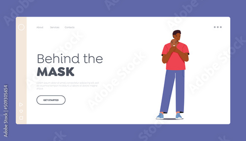 Depressed Man Hide Face behind Mask Landing Page Template. Unhappy African Male Character with Happy Smiling Mask