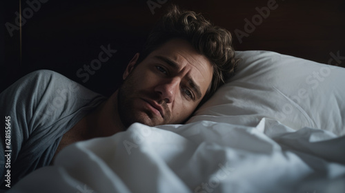 Depressed man lying in bed can't sleep late at morning with insomnia.