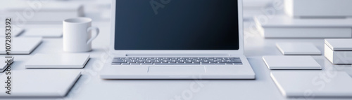 Description A minimalist workspace featuring a laptop, white notebooks, and a mug, promoting a clean and organized digital environment.