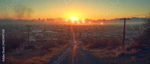Desert road leads toward distant city skyline aglow with fireworks during sunrise, showcasing scenic landscape.