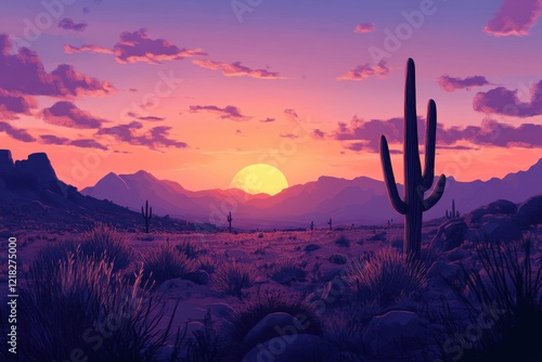 Desert sunset with cactus in foreground . A picturesque desert scene showcasing cacti and mountains under a stunning sunset backdrop.