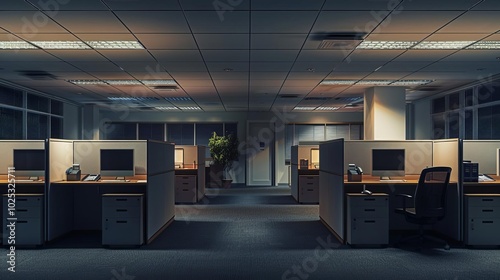 Deserted office cubicles wide shot night scene dimly lit soft shadows peaceful setting