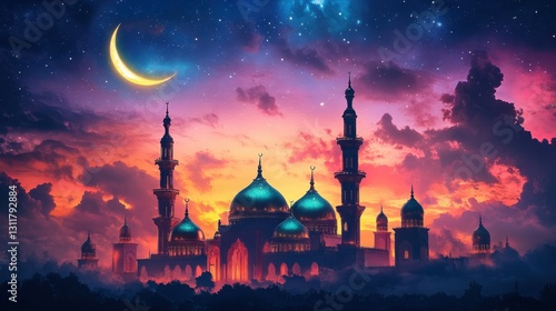 Design a 3D mosque with glowing domes and minarets in vibrant, futuristic gradients.