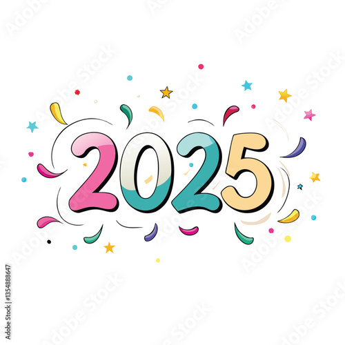 Design a celebratory 2025 text graphic, incorporating colorful confetti and a dynamic, festive layout. The design should be visually appealing and suitable for celebratory use.