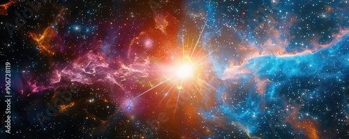 Design a dynamic starburst within a colorful nebula, front view, showcasing galactic energy, cybernetic tone, Complementary Color Scheme, copy space for text,