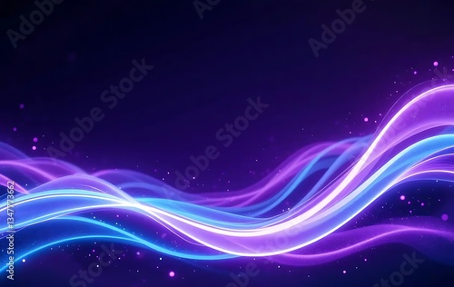 Design a futuristic neon background with flowing neon blue and purple waves on a dark purple background. The waves should have a smooth, flowing appearance,
